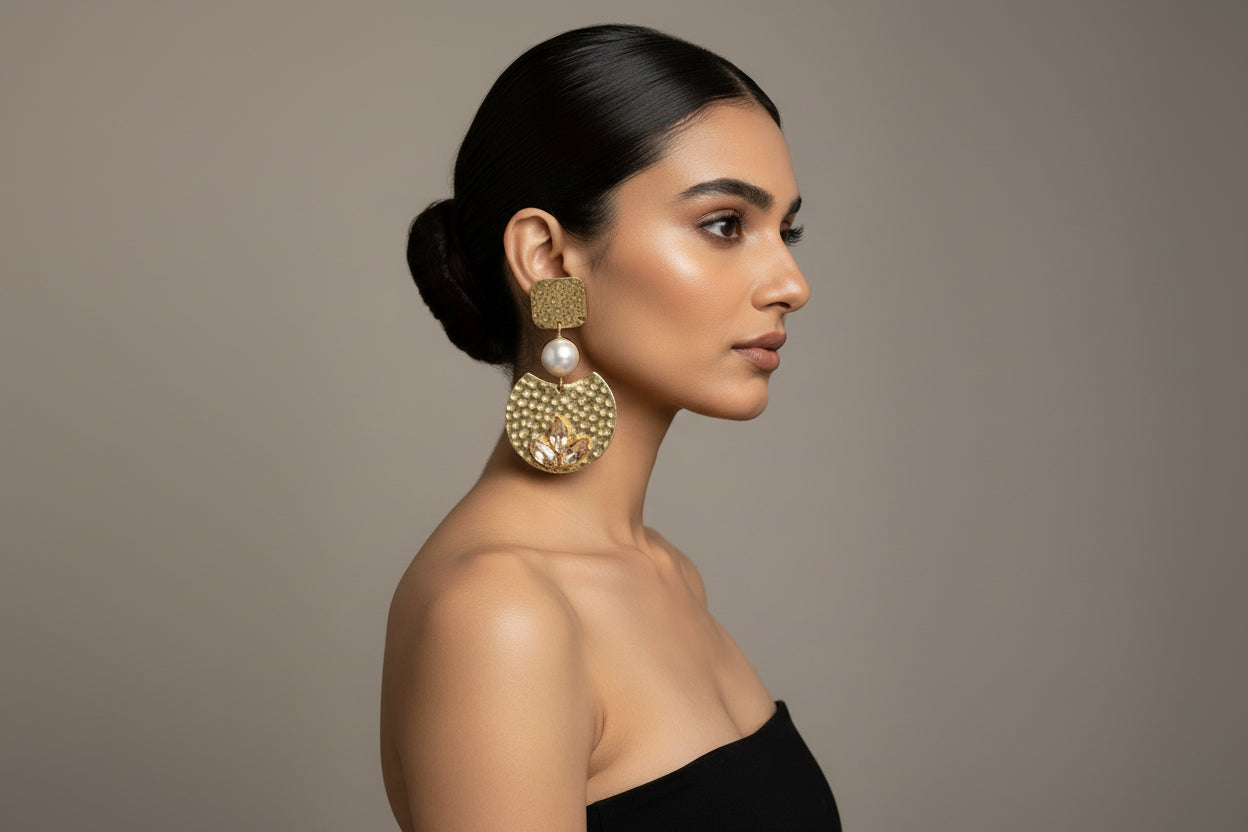 Crafted from quality brass, these earrings feature rich maroon stones that deliver sophisticated color depth and visual interest. The combination of warm metallic brass with deep maroon tones creates a versatile piece suitable for both everyday wear and special occasions. The stone setting is secure and durable, designed to maintain its lustrous appearance through regular use. These earrings offer an elegant alternative to conventional jewelry, blending traditional craftsmanship with contemporary styling. Perfect for those seeking distinctive accessories that complement a refined aesthetic.